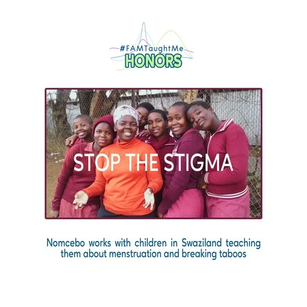 FAMTaughtMe Honors Stop the Stigma by Nomcebo Mkhaliphi. Nomcebo works voluntarily in Swaziland educating children about menstruation. She teaches about stopping the stigma around menstruation and breaking taboos.