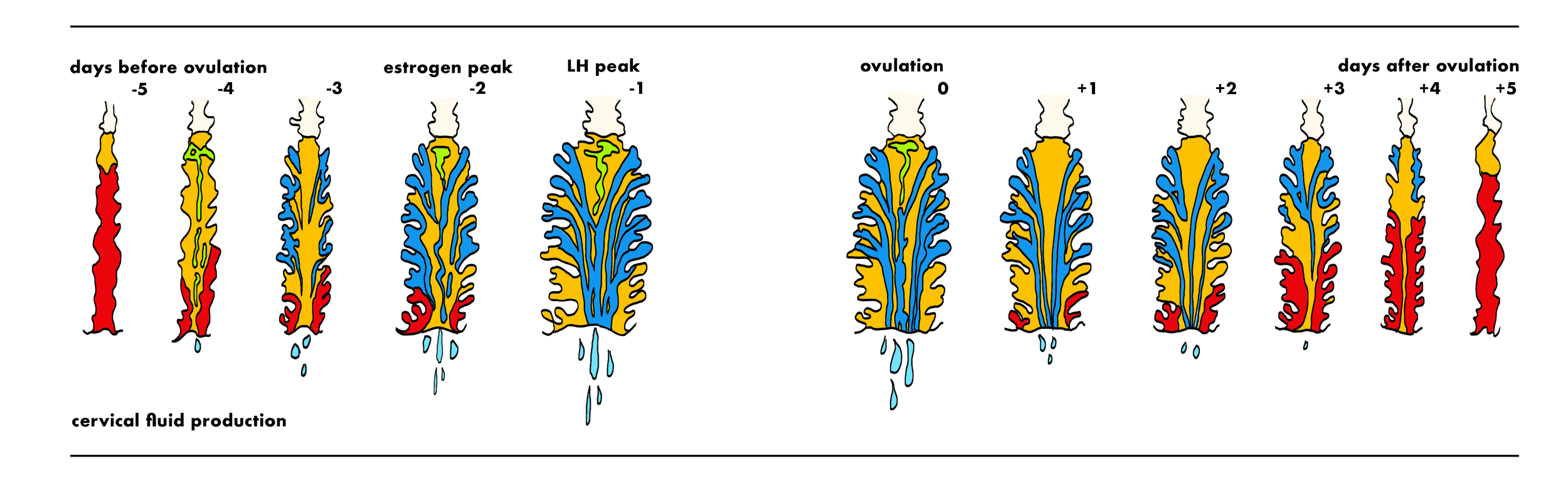 When estrogen production in the ovary increases during the follicular phase, the cervix’s mucus plug dissolves (red) and the cervix opens to produce cervical fluid (blue). Sensation changes at the vulva also occur, becoming more moist and slippery. This indicates the start of the fertile window and impending ovulation.